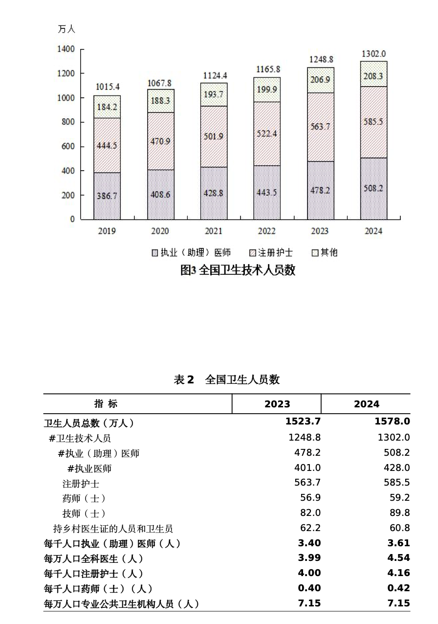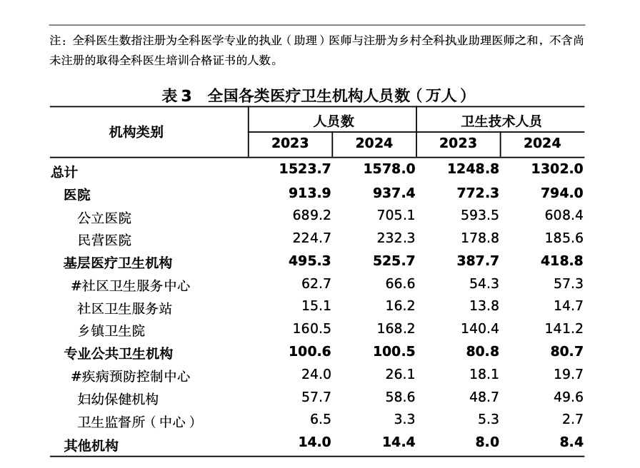 2024年末,全国卫生人员总数1578.0万人,比上年增加54.2万人(增长 3.6%)。
