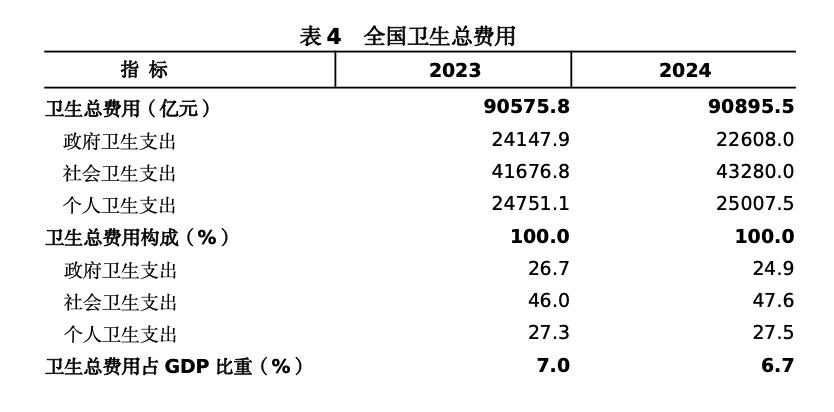 《公报》表明,次均医疗费用控制有成效。2024年,医院次均住院费用9870.0元,按当年价格比上年下降4.3%,按可比价格下降4.5%;次均门诊费用361.0元,按当年价格比上年下降0.2%,按可比价格下降0.4%。2024年全国卫生总费用初步核算为90895.5亿元,其中:政府卫生支出22608亿元,占24.9%;社会卫生支出43280亿元,占47.6%;个人卫生支出25007.5亿元,占27.5%。人均卫生总费用6454.4元,卫生总费用占GDP的比重为6.7%。