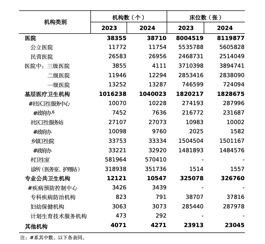 与上年比较,床位增加12.5万张,其中:公立医院增加7.0万张,民营医院增加4.5万张;基层医疗卫生机构床位增加0.8万张,专业公共卫生机构床位增加0.2万张。每千人口医疗卫生机构床位数由2023年7.23张增加到2024年7.32张。
