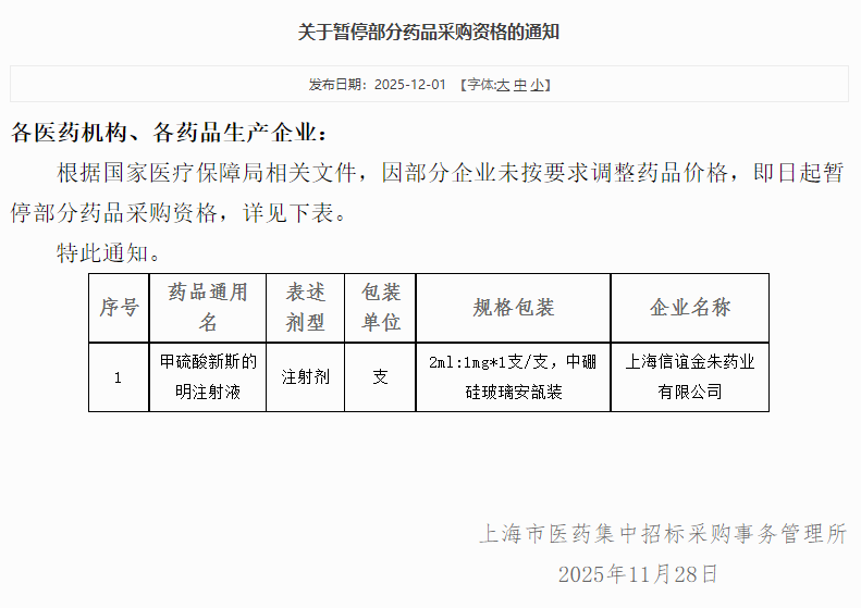 12月1日,上海阳光医药采购网发布通知,因未按时调整价格,暂停上海医药集团股份有限公司(下称上海医药)旗下上海信谊金朱药业生产的甲硫酸新斯的明注射液(规格:2ml:1mg*1支/支,中硼硅玻璃安瓿装)采购资格。