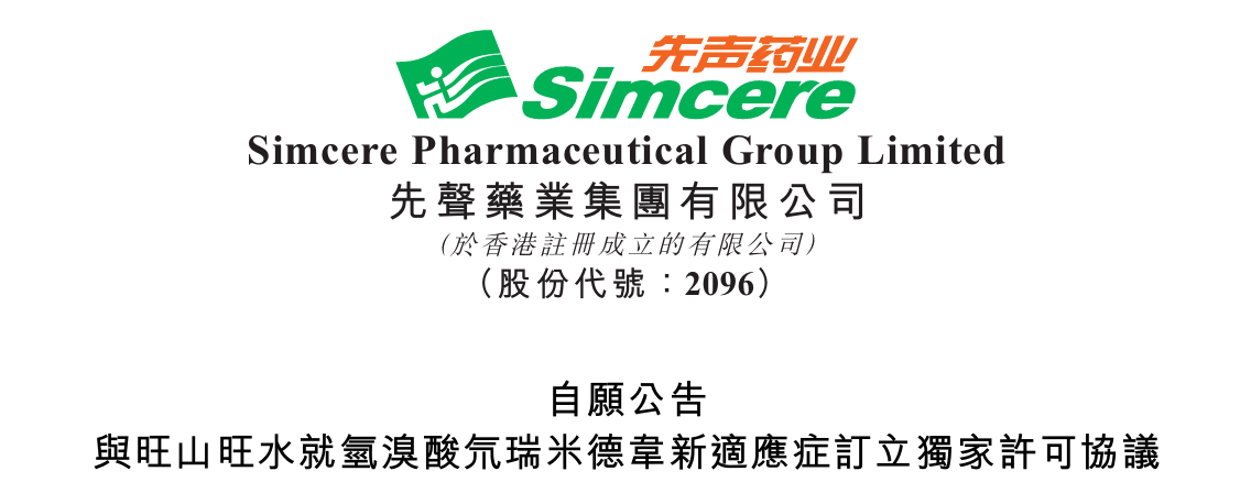 先声药业与苏州旺山旺水同时发布公告,双方就氢溴酸氘瑞米德韦订立许可协议。