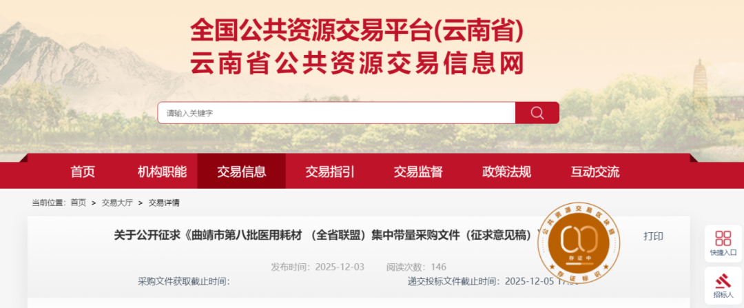 12月3日,云南省耗材集采领域迎来新动态,曲靖市药品和医用耗材采购服务中心正式发布《曲靖市第八批医用耗材(全省联盟)集中带量采购文件(征求意见稿)》意见征求公告,标志着云南省新一轮医用耗材集中带量采购工作正式拉开帷幕。