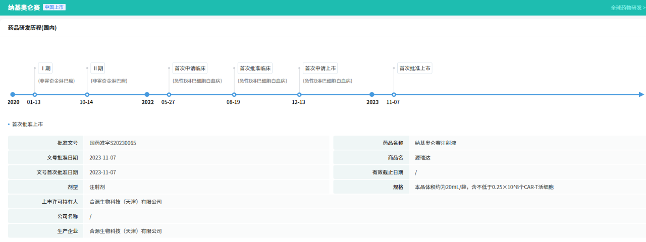 合源生物的纳基奥仑赛,在2023年获批上市,是目前唯一覆盖白血病和淋巴瘤两大血液肿瘤的国产CAR-T。上月初的国家医保目录现场谈判与商保创新药目录价格协商现场,该品种谈判很成功,成为首个借商保路径取得进展的 CAR-T产品。