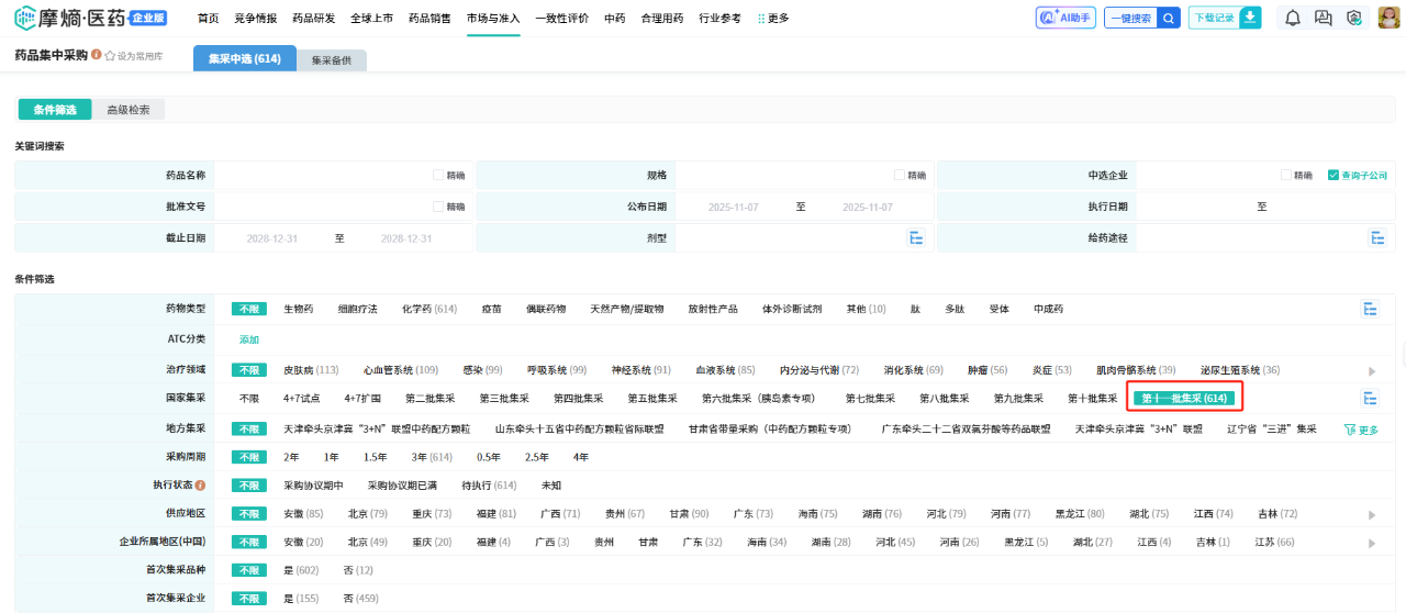 已完成第十一批集采数据的全面更新,提供包括药品名称、规格、剂型、报量、各省供应量等多维度信息,帮助用户快速获取最新中标情报,深度洞察集采品种的市场格局与竞争态势,为市场准入、产品布局与竞争分析提供坚实的数据支撑。
