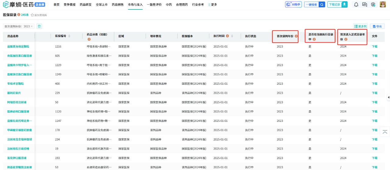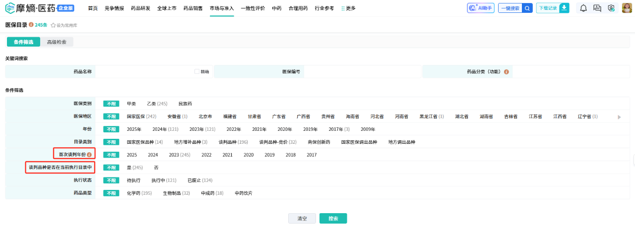 新增【首次谈判年份】与【谈判品种是否在当前执行目录中】两大检索字段,并在信息列表页清晰展示药品的首次谈判年份、当前目录状态(是否在执行目录中)以及首次进入正式目录的年份,助力用户快速追溯药品的医保准入历程,为市场分析与决策提供更高效的数据支持。