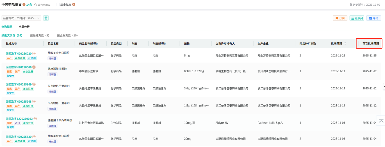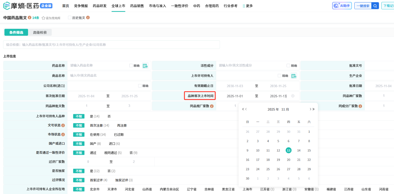 此外,还新增【品种首次上市时间】检索字段并配套展示相关数据,方便用户快速查询目标品种的首次获批上市时间。
