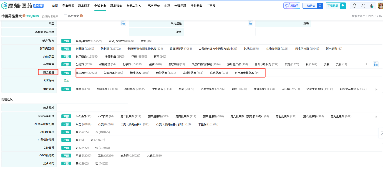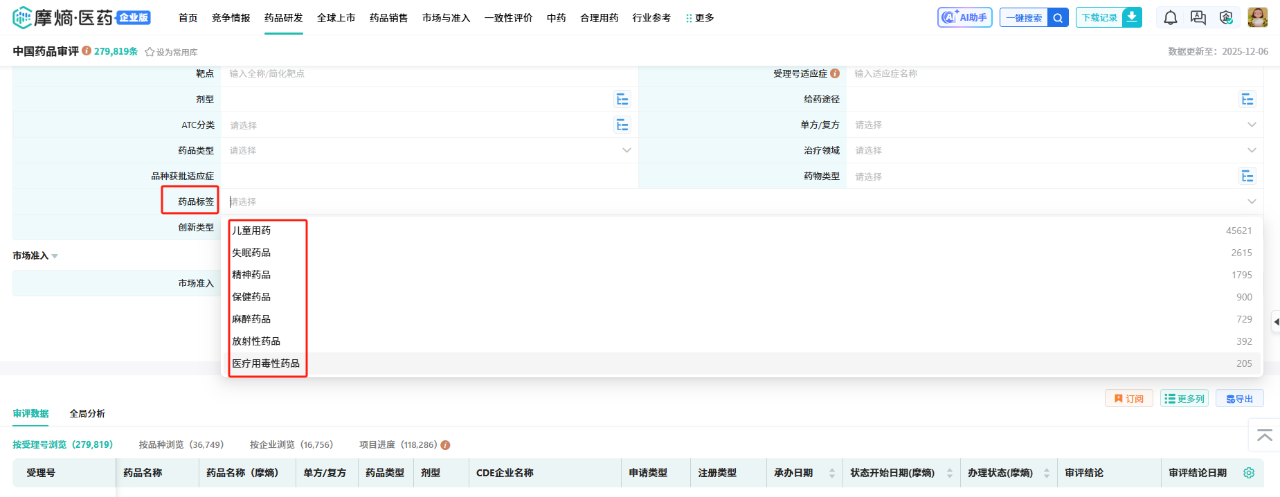 新增【药品标签】筛选项,通过将药品按“儿童用药”“精神药品”“麻醉药品”“医疗用毒性药品”等关键标签进行归类,使用户能够快速定位目标类别的审评信息,提升数据检索的精准度与效率。