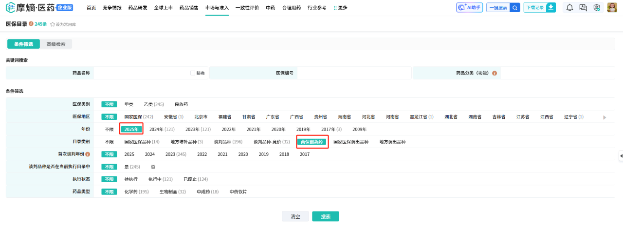 功能优化:本次对全球上市、药品研发数据库群中的中国药品批文及审评数据库,还有市场与准入库群的医保目录数据库,均升级优化了数据检索与展示功能。