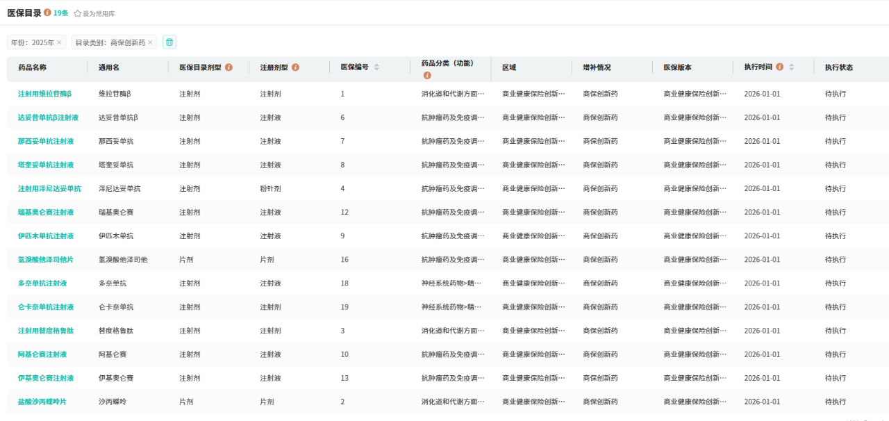依照国家医保局人力资源社会保障部医保发〔2025〕33号文件——2025年《新版药品目录》以及《商保创新药目录》,数据库已同步更新2025年国家医保目录最新数据,涵盖最新版目录内所有药品的分类、剂型、支付范围及增补详情等关键信息,为企业提供权威、及时的决策参考。