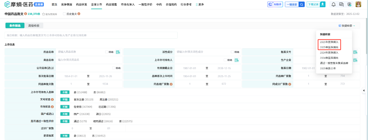 新增【快捷检索】功能,提供重点/热门检索字段的快速入口,内置多项预设筛选条件,如“2025年医保调入/调出”“通过一致性评价暂未集采品种”“2025年新上市”等,实现高频检索需求的精准直达。
