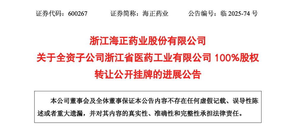 刚刚,浙江海正药业股份有限公司发布公告,其全资子公司浙江省医药工业有限公司(下称“省医药公司”)100%股权转让公开挂牌迎来新进展。