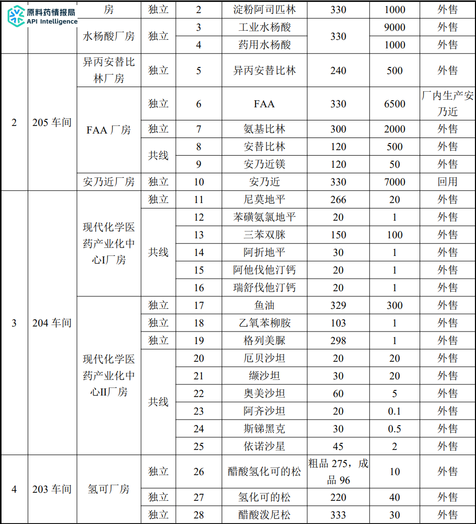 在建项目依托现有207车间建设1条水杨酸铋、水杨酸钠、水杨酸镁共用生产线。204车间包含现代化学医药产业化中心I厂房和现代化学医药产业化中心Ⅱ厂房。203车间主要包含氢可生产厂房和溶剂回收车间。