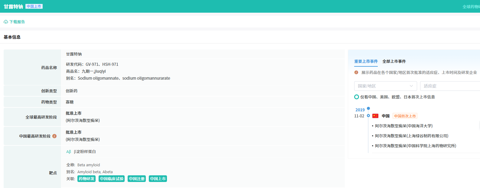2019年11月,绿谷医药的甘露特钠胶囊获国家药监局有条件批准上市,获批适应症为“用于轻度至中度阿尔茨海默病,改善患者认知功能”;2021年,该药品获纳入国家医保目录。