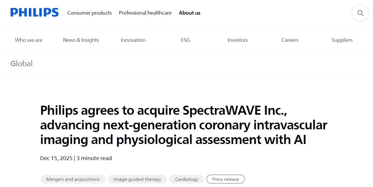 飞利浦影像引导治疗业务首席执行官Bert van Meurs指出:“此次收购公告的发布,意味着我们在持续拓展微创影像引导治疗手术的应用范围——这类手术已被证实能改善患者结局,同时提升医疗成本效益。收购SpectraWAVE新一代的冠脉血管内影像与功能评估技术,是我们用突破性AI技术扩充产品组合的重要一步,能帮助临床医生在单一诊疗场景下,完成从决策、引导、治疗到疗效确认的全流程工作。”