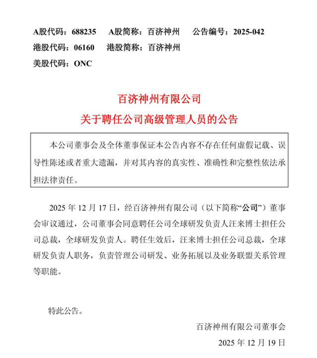 12月19日,百济神州发布公告,汪来将担任百济神州总裁。据悉,吴晓滨继续担任总裁,与汪来并列为双总裁。