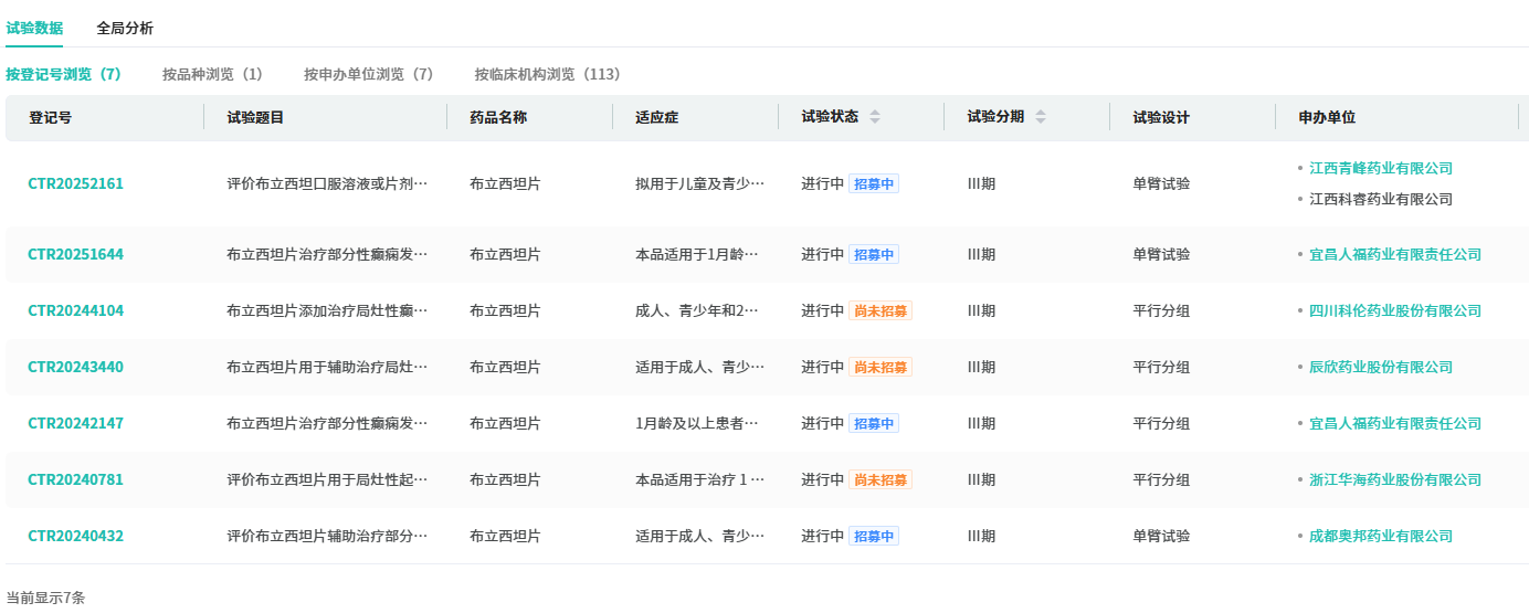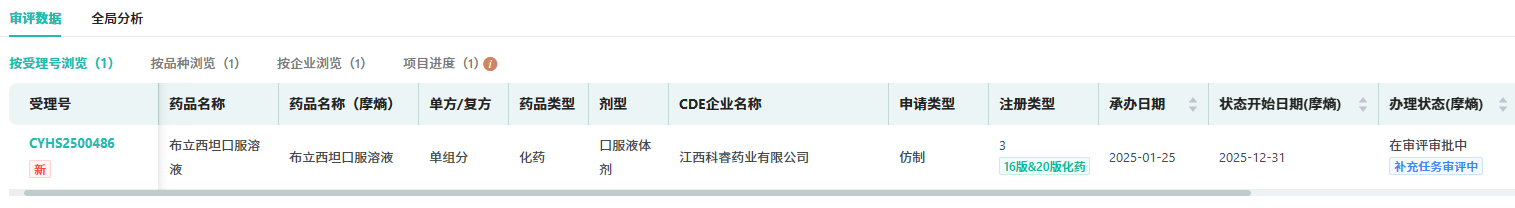 目前,布立西坦口服溶液仅有江西科睿药业一家药企报产在审。