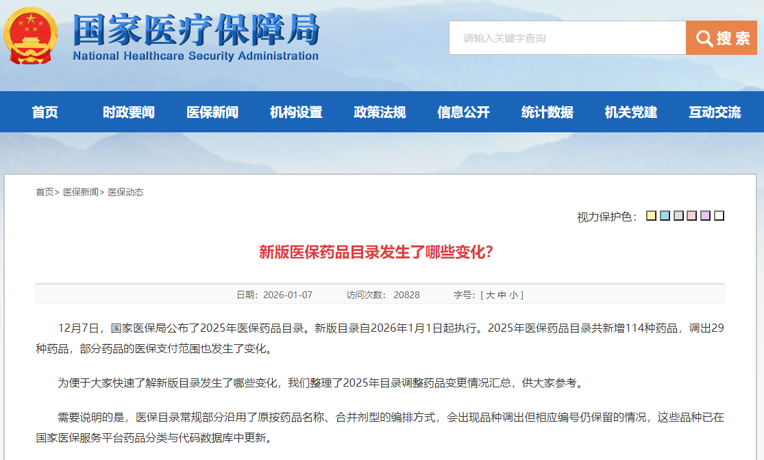 2026年1月7日,国家医保局官方发布《新版医保药品目录发生了哪些变化?》一文,揭开了2025年医保药品目录调整的完整面纱。新增114种、调出29种、支付范围调整65种——这组数字背后,是一场关于药品临床价值的严格筛选。