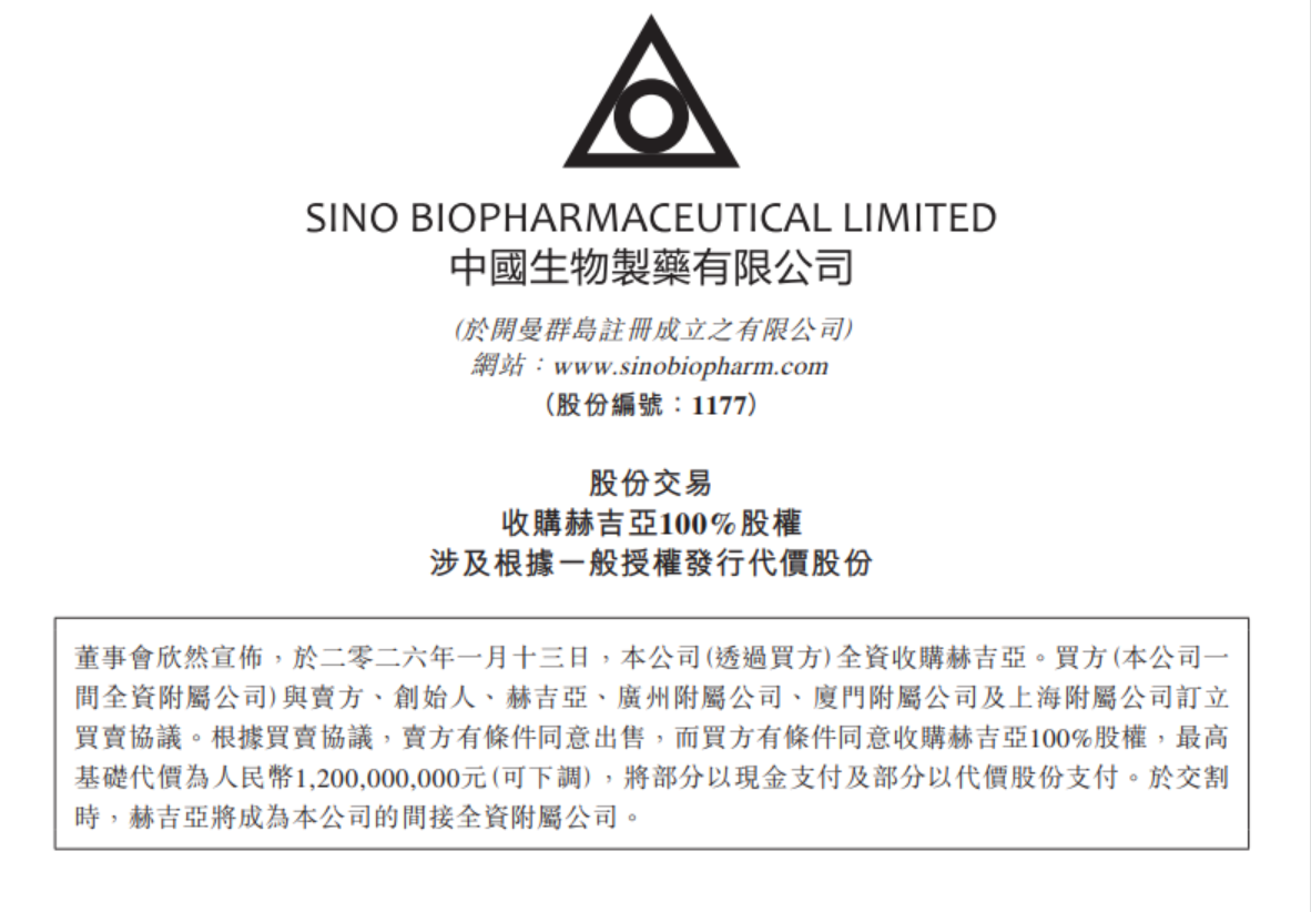 1月13日,中国生物制药(HK.1177)宣布以12亿元收购赫吉亚生物100%的股权。值得关注的是,这是继战略收购礼新医药后,该公司第二笔对中国Biotech的收购。