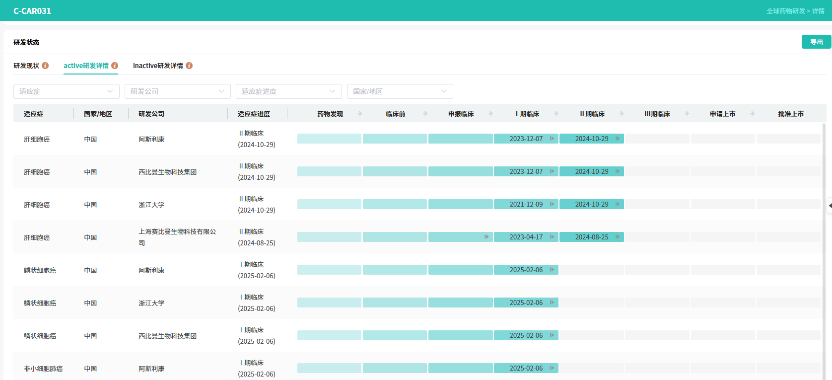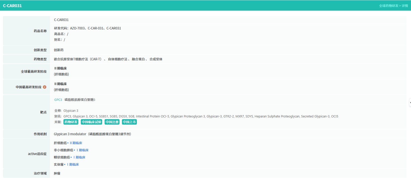 C-CAR031 作为一种自体、靶向磷脂酰肌醇蛋白聚糖3(GPC3)的 CAR-T 疗法,凭借阿斯利康的显性负性转化生长因子 -β 受体 II(dnTGFβRII)装甲平台设计,正积极开展针对肝细胞癌(HCC)及其他实体瘤的研究。其中,HCC 适应症已进展至 II 期临床阶段。