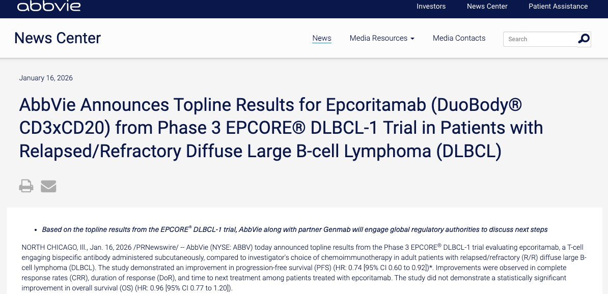 受临床结果影响,Genmab股价在消息公布后下跌约5%,艾伯维股价亦出现小幅波动。目前,EPCORE DLBCL-1试验仍在进行中,完整数据待后续分析。艾伯维与Genmab表示,正综合评估多项潜在影响因素,包括试验期间Omicron变异株感染高峰对入组及随访的干扰(当时疫苗尚未广泛普及),以及研究周期内CAR-T、抗体偶联药物(ADC)等新型抗淋巴瘤疗法的普及对患者后续治疗选择的影响。双方计划与全球监管机构进一步沟通,以确定该药的后续注册与标签更新策略。