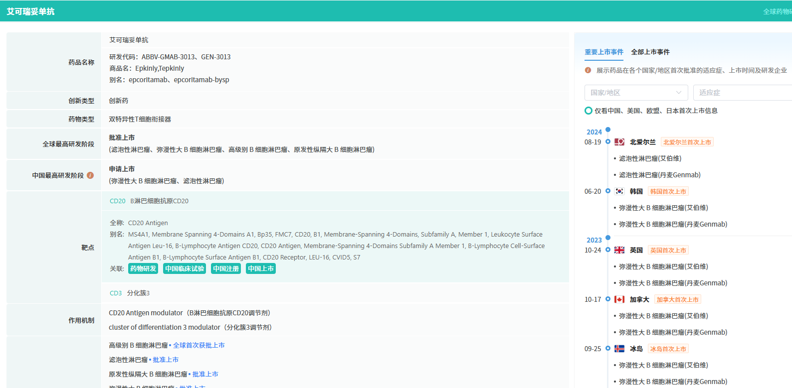 1. 艾伯维:CD3/CD20双抗艾可瑞妥单抗c获CDE受理