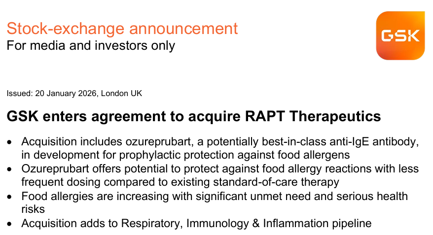 1月20日,葛兰素史克(GSK)宣布以22亿美元全现金交易收购美国生物制药公司RAPT Therapeutics,获得其核心管线长效抗IgE单抗 ozureprubart 的全球开发权(中国大陆及港澳台地区除外)。