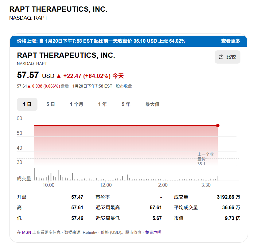 该药物目前处于预防食物过敏的IIb期临床阶段,通过每12周一次皮下注射的给药设计,有望解决现有疗法需频繁注射的痛点。交易完成后,RAPT股东将获得每股58美元的收购对价,较前一日收盘价溢价64%,公司盘前股价应声暴涨。目前市值9.73亿美元。