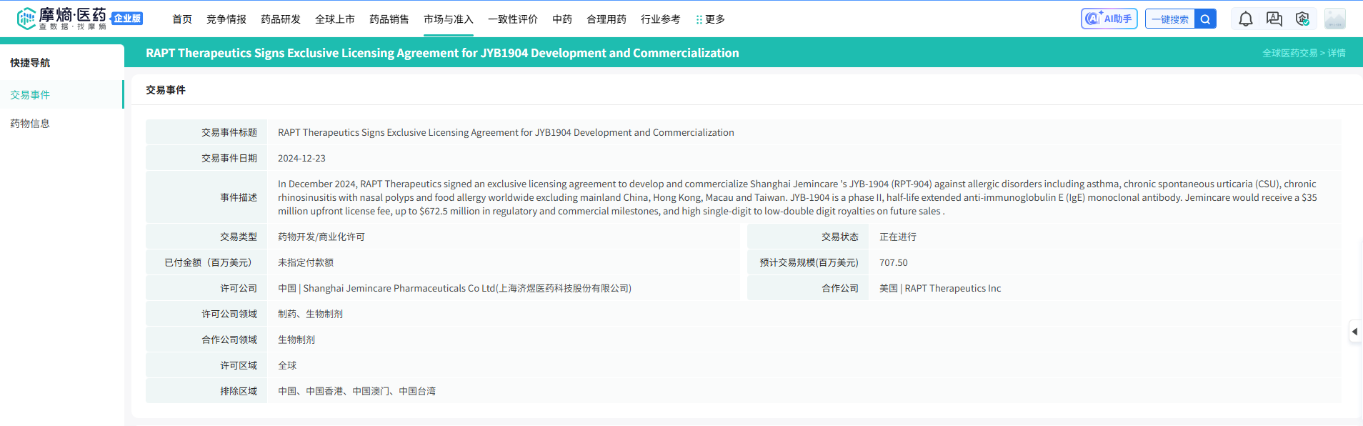 Ozureprubart最初由中国公司济民可信旗下上海济煜医药研发,2024年12月以7.075亿美元授权给RAPT Therapeutics,其中包含3500万美元首付款和最高6.725亿美元里程碑付款。此次收购使GSK承接对济煜医药的后续支付义务,同时获得该药物在大中华区外的全球权益。
