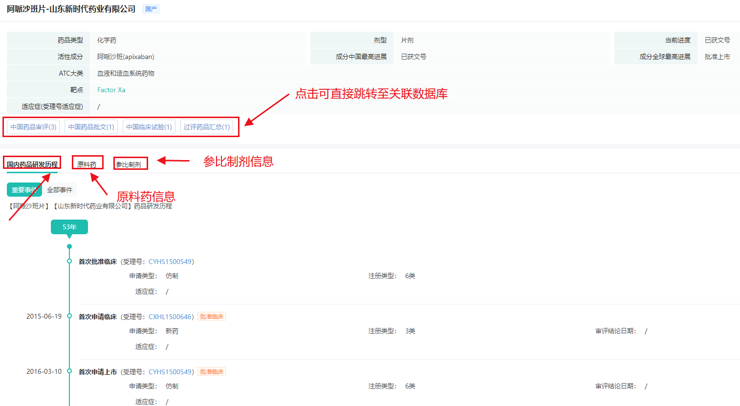 点击药品名称进入项目详情页,可以查看药品基本信息、原料药信息、参比制剂信息、市场销售表现以及药品研发时间轴等关键内容。