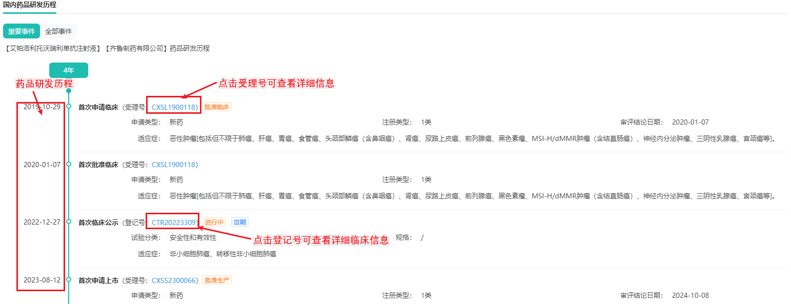 药品研发时间轴:提供项目国内立项、临床试验、审批和上市的时间线信息,帮助用户了解品种国内研发历程。