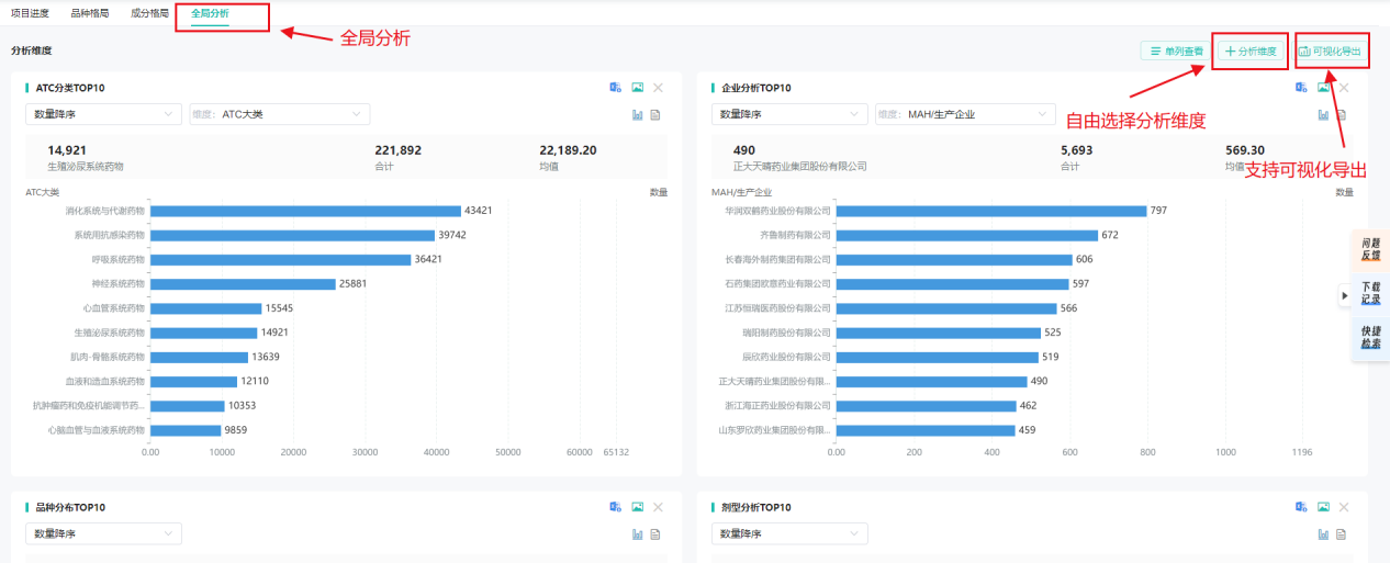 全局分析,分析维度涵盖ATC分类、企业分析、品种分析、剂型分析、靶点分布等多个维度,满足不同场景的特定需求。同时,数据库采用图表等可视化分析方式,使复杂的数据更加直观易懂,并且支持下载,方便用户进行进一步的分析和报告制作。