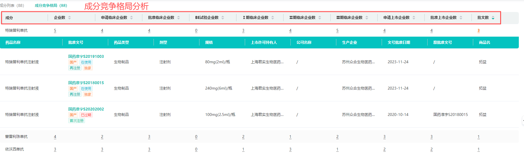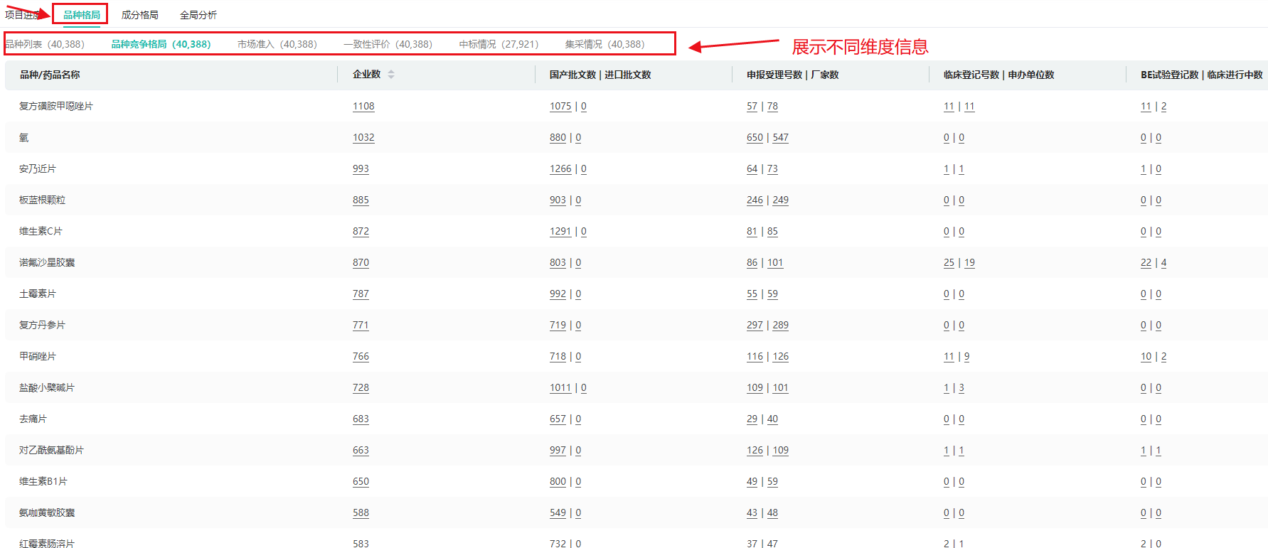 品种竞争格局:汇总了不同药品的布局企业数量,国产批文数/进口批文数,申报受理号数/厂家数、临床登记号数/申办单位数、BE试验登记数/临床进行中数等多维度统计数据。