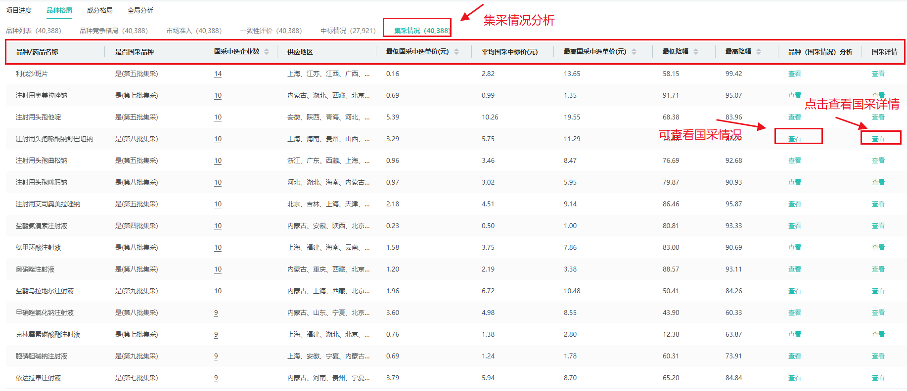 集采情况:提供药品是否国采品种、国采中选企业数、供应地区、最低国采中选单价、平均国采中标价、最高国采中选单价、最低降幅、最高降幅、品种等关键集采指标;点击品种进入其详情页,可以了解该品种的国采情况,分析企业中选价格和首年约定采购量。
