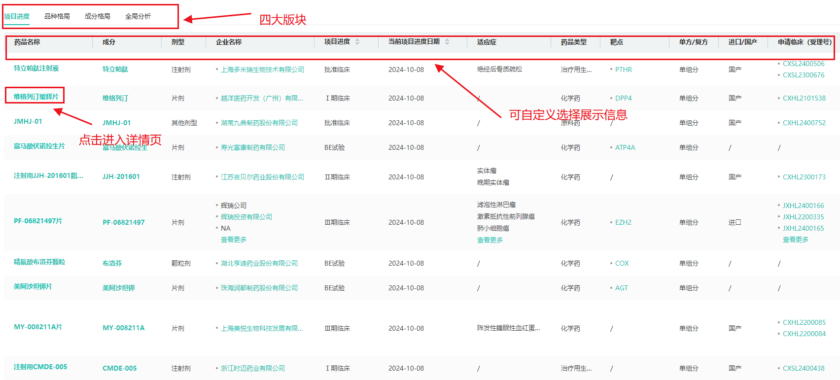 品种格局数据库包含项目进度、品种格局、成分格局、全局分析四大核心版块,每个版块都提供了丰富的分析工具和数据支持,帮助用户进行全方位的医药项目分析。