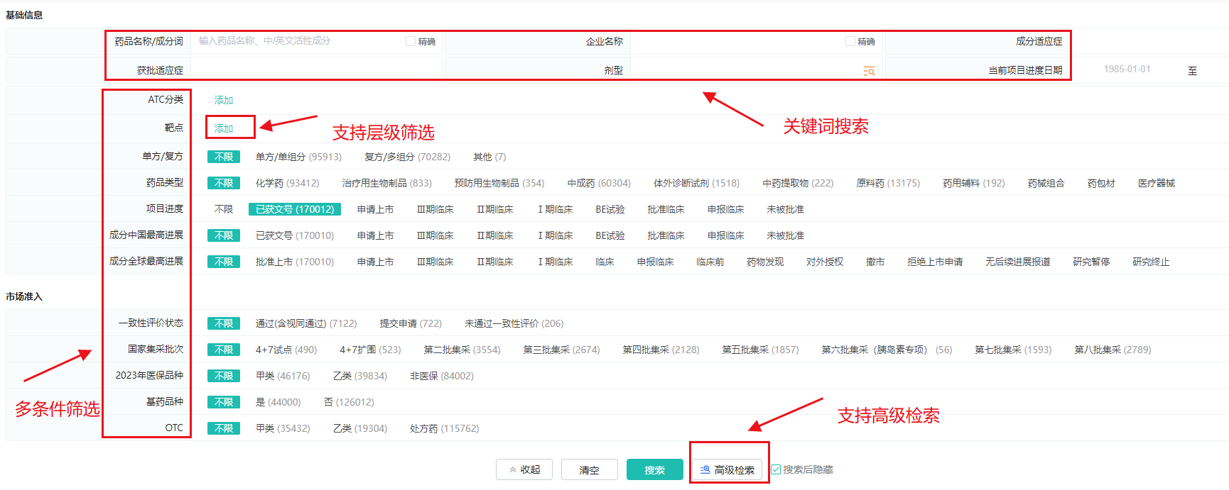 “品种格局数据库”具备高效便捷的数据检索功能。用户可通过药品名称、企业名称、成分/获批适应症、剂型、项目进度日期等关键词进行快速搜索,同时支持ATC分类、靶点、药品类型、项目进度、一致性评价状态、国家集采批次、医保品种等多条件筛选,其中ATC分类和靶点还支持层级筛选。高级检索功能,允许用户通过逻辑关键词AND、OR、NOT构建复杂的查询逻辑,实现精准查询。