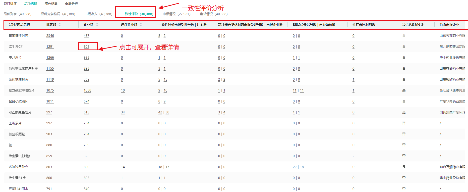 一致性评价:覆盖了药品的批文数、企业数、过评企业数、一致性评价申报受理号数/厂家数、新注册分类仿制药申报受理号数/申报企业数、BE试验登记号数/申办单位数、推荐参比制剂数、是否达5家过评、首家申报企业、企业进展等信息。