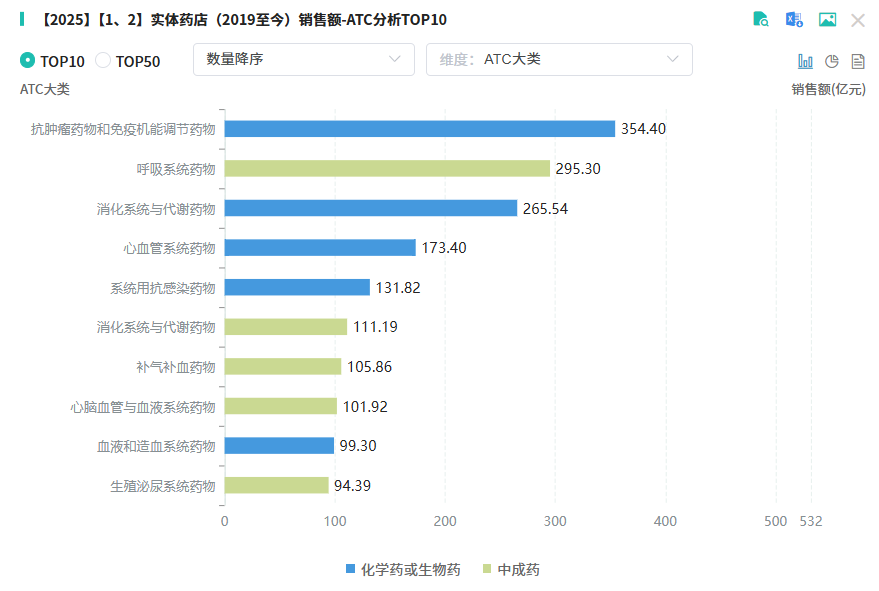 零售市场方面,实体药店自2019年至今近三年持续上涨。摩熵医药数据库显示,2025年上半年实体药店销售总额达2137.35亿元,同比上涨0.37%。从治疗领域看,抗肿瘤与免疫调节药、呼吸系统药物、消化系统与代谢药三大板块表现强劲,在实体药店市场中,这三大板块销售额合计超260亿元,成为支撑实体药店市场的“三驾马车”。