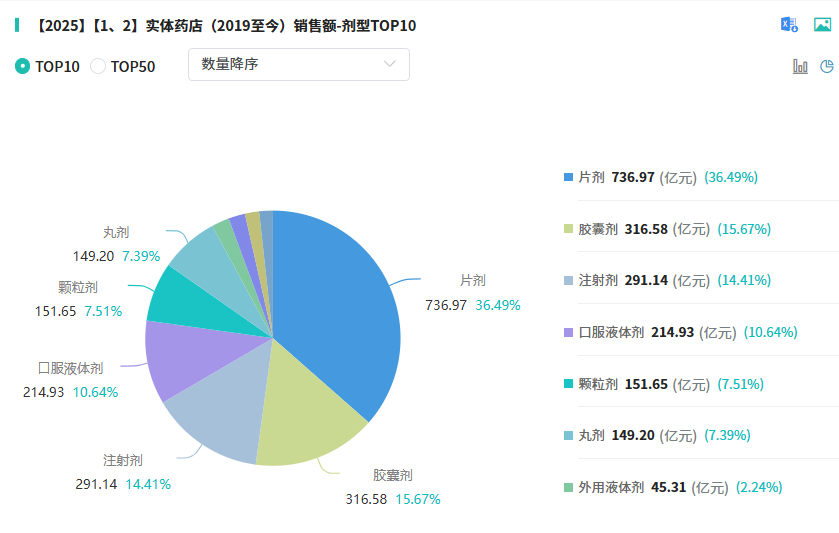 剂型分布方面,2025年上半年实体药店以口服剂型为主导,其中片剂占36.49%、胶囊剂占15.67%,两者合计超过五成;注射剂占14.41%,位居第三。