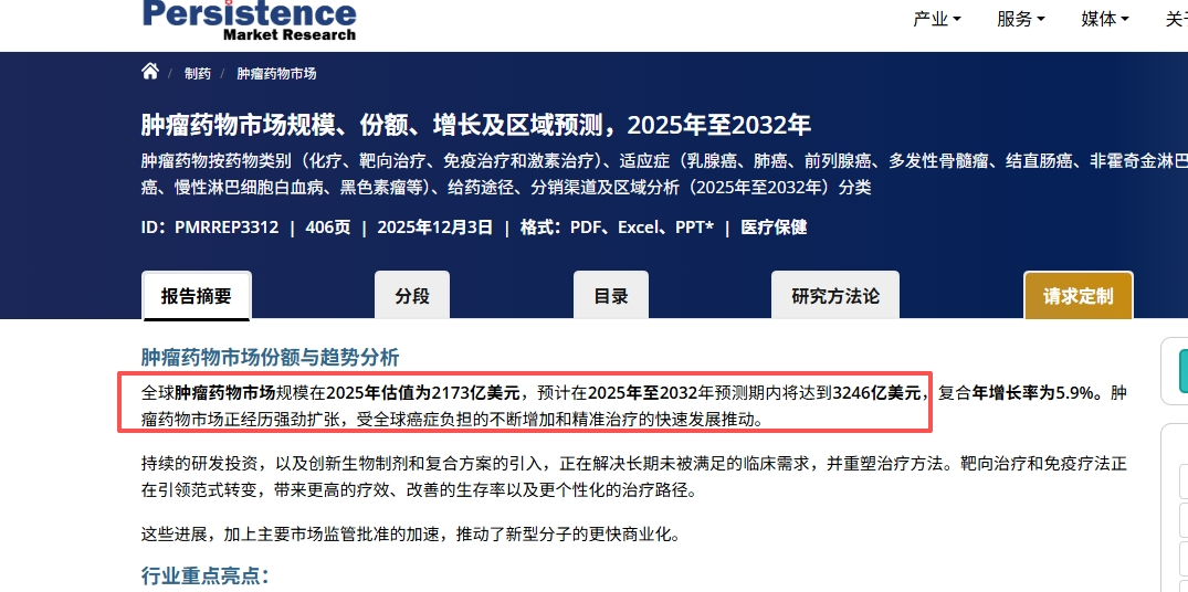 根据Persistence Market Research,2025年肿瘤药物市场规模估值为2173亿美元。