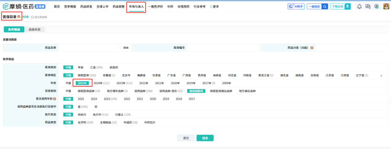 目前,摩熵医药数据库已更新2025年医保目录,其药品分类及增补情况等详细数据,可在摩熵医药 - 市场准入 - 医保目录查看,为行业研究决策提供支撑。