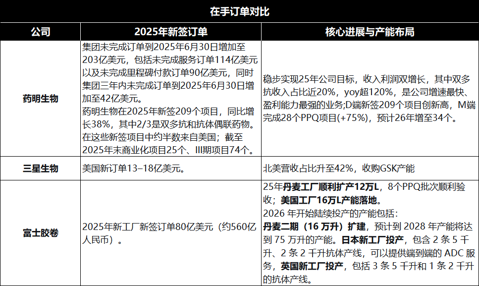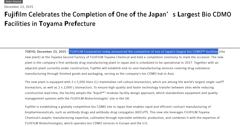 Fujiflim 在2026年1月的JPM会议透露:“新签80亿美元订单(客户包括强生、再生元、Argenx等)。25年丹麦工厂顺利扩产12万L,8个PPQ批次顺利验收;美国工厂16万L产能落地;公司预计2028年产能将扩至75万L,其中ADC在2027年具备端对端的GMP生产能力。”