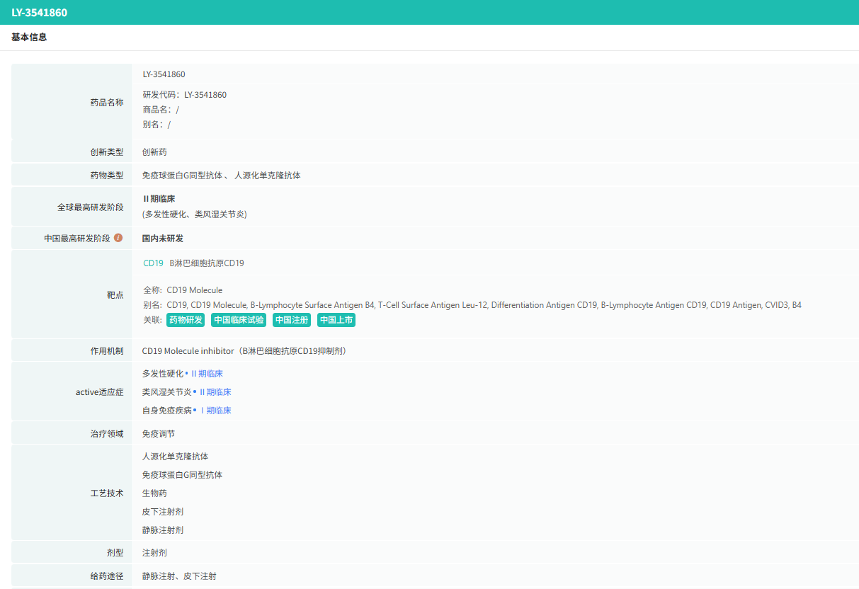LY3541860 是礼来在 2019 年以约 4.87 亿美元(现金 + 里程碑)对 Immune Design 公司的收购。当时礼来意图借此获取其免疫治疗平台技术,并迅速将 LY3541860 推向临床,布局多发性硬化症(MS)和类风湿性关节炎(RA)。