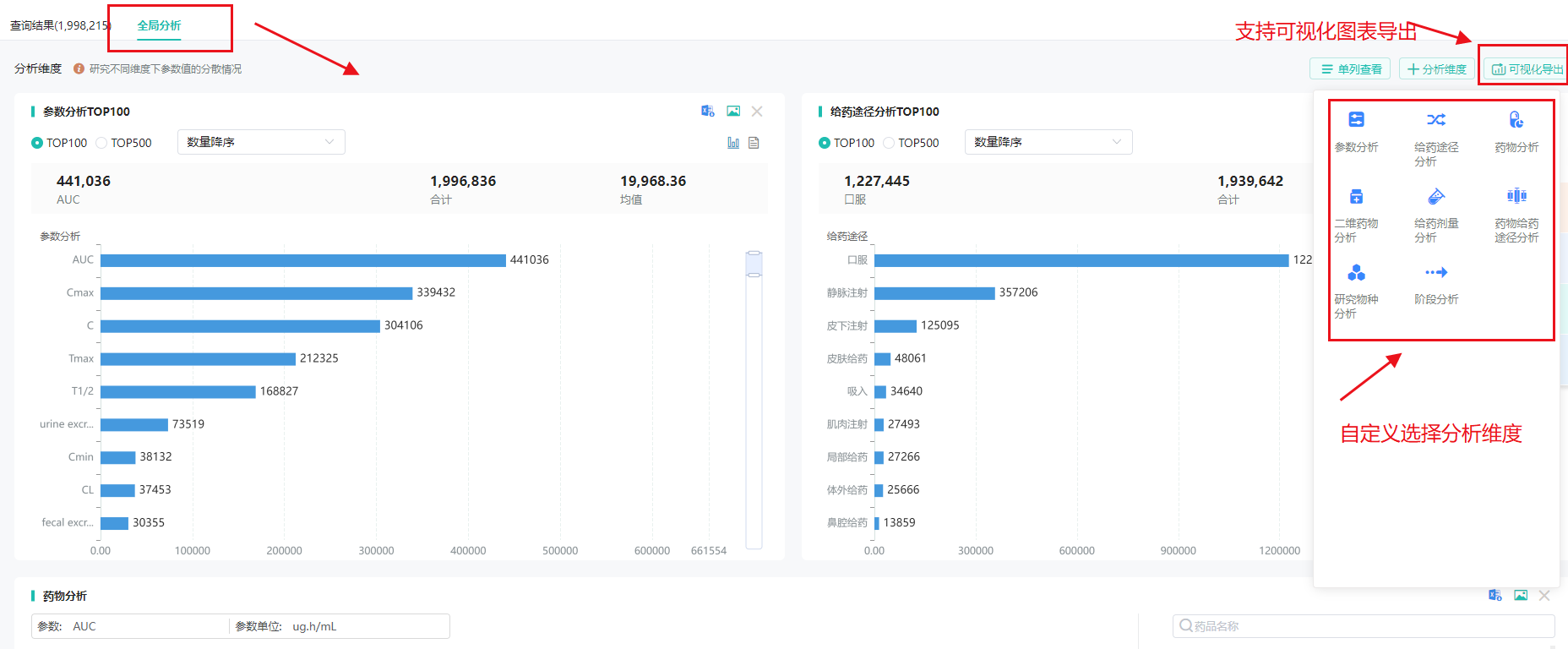 全局分析功能支持多维度分析,方便用户研究不同维度下参数值的分散情况,涵盖参数分析、给药途径分析、药物分析、二维药物分析、给药剂量分析、药物给药途径分析、研究物种分析、阶段分析等多个方面。