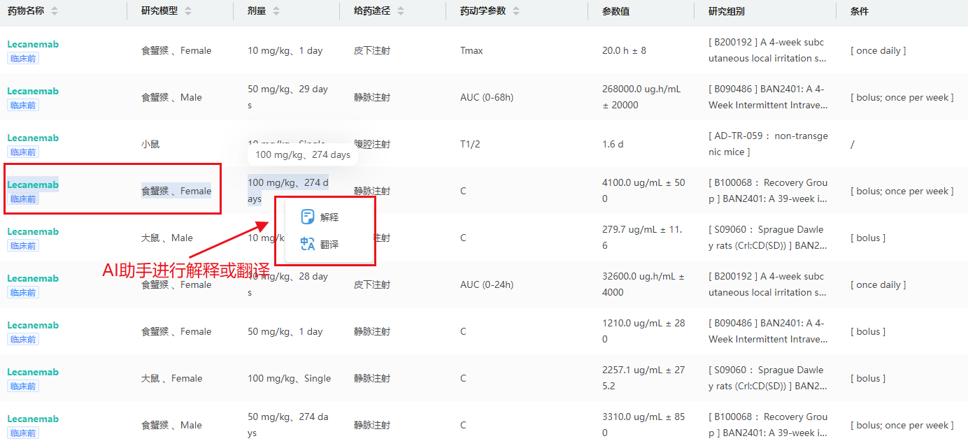 药代动力学数据版块,包含药物发现阶段至上市阶段的药物吸收、分布、代谢与排泄(ADME)的相关实验数据,提供了药物的药代动力学参数,如半衰期、清除率、生物利用度等,药动学研究模型、给药方式、给药剂量、给药时间,以及实验相关条件等信息,为药物剂量设计和给药频率的确定提供有力参考。