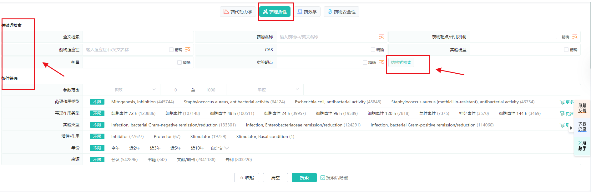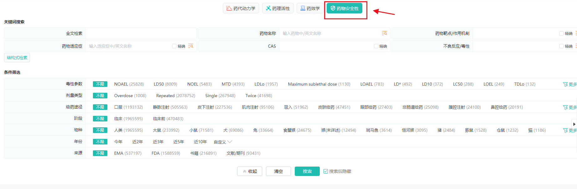 (1)数据搜索:可以按药物名称、药理分类、药物靶点/作用机制、适应症、结构式等检索,横向对比同类药物药理毒理特征;各数据模块详尽的列出多维的检索条件,方便用户快速检索到目标数据。