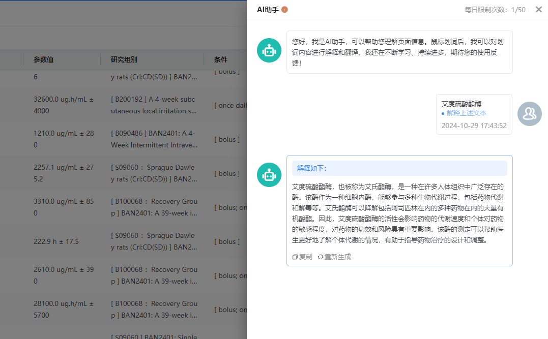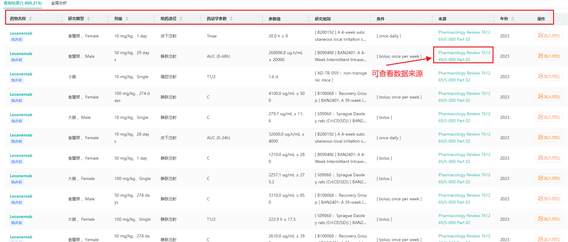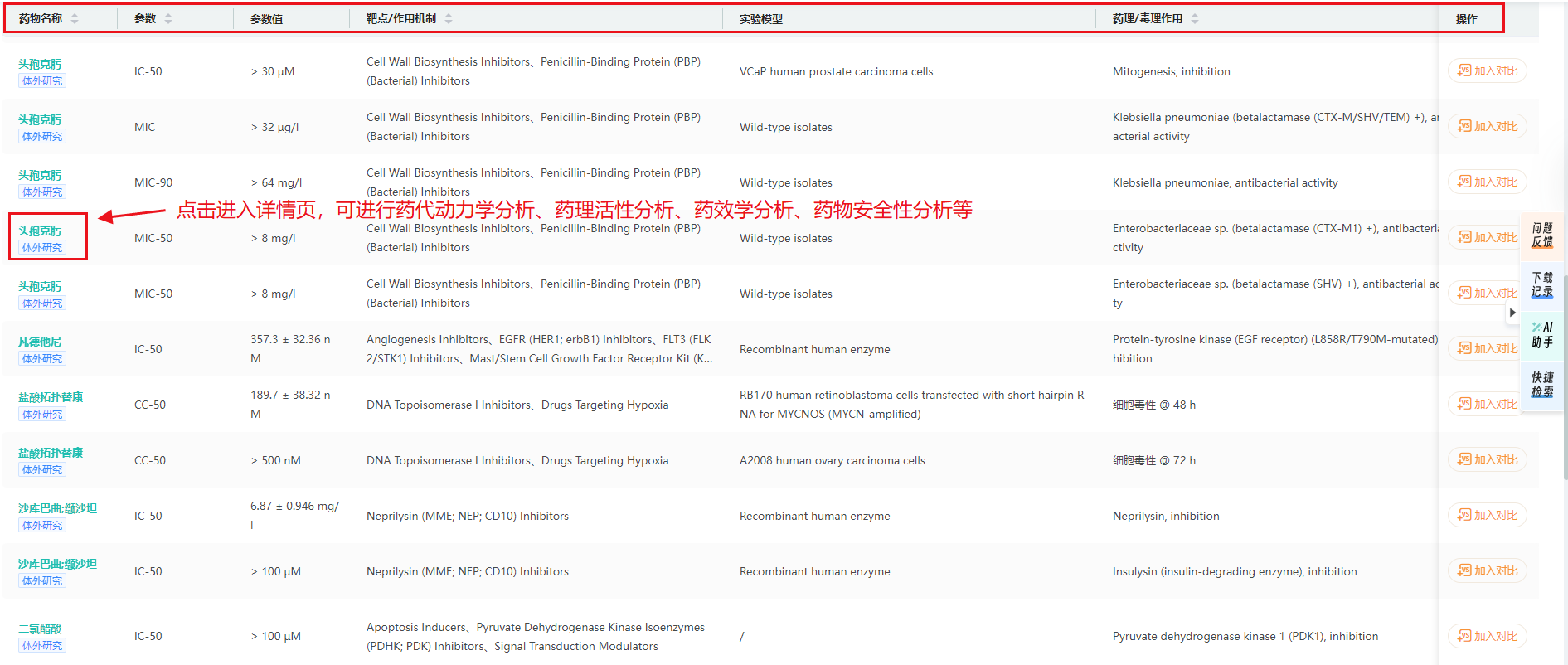 在信息展示页,实验数据提供参考来源,可追溯原始文件或期刊等查看详细实验设计、动物模型等信息。点击药品名称进入详情页,可进行药品的药代动力学分析、药理活性分析、药效学分析、药物安全性分析,以及查看药品在全球的上市信息。