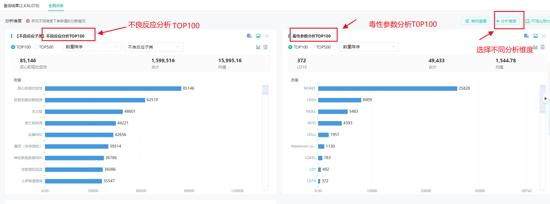 全局分析功能,帮助用户对药品进行深入的多维度分析,涵盖了参数分析、药理作用类型分析、毒理作用类型分析、实验类型分析及药物分析等多个层面。