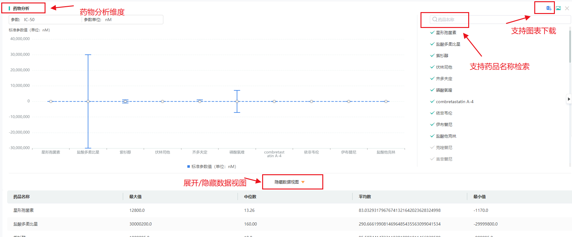 (2)可视化分析:提供参数统计、药物参数值统计、多维度参数对比、可视化分析;可视化支持导出、排序、参数选择、对比等功能。