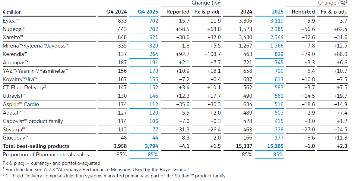 剖开产品线的细部结构,拜耳当前的真实处境与潜在机遇便一目了然。财报中最鲜明的底色,正是这场“新旧动能切换”的渐进过程——老药退潮与新药破局同台上演。