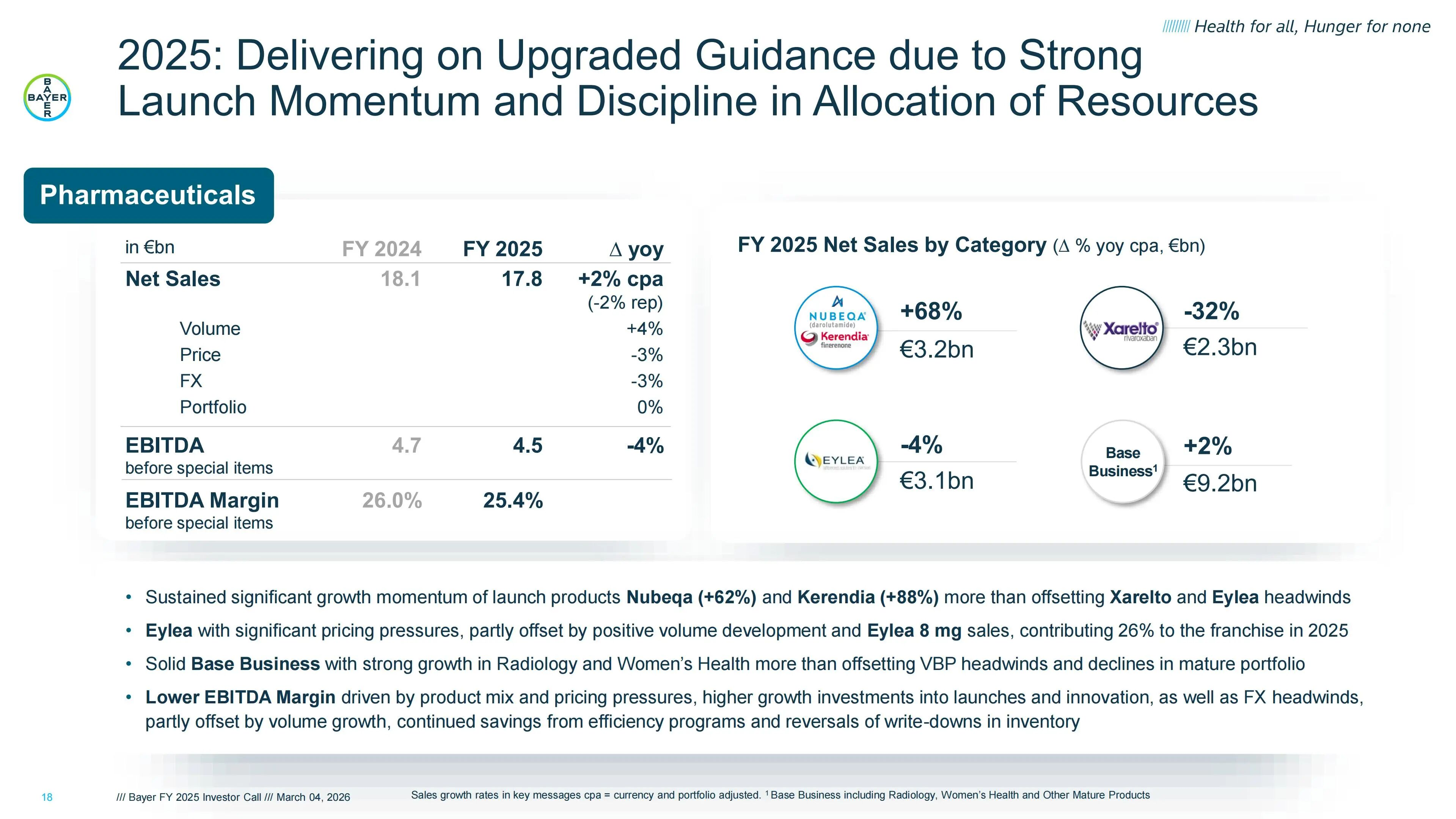 一方面是“守”的压力。抗凝药 Xarelto(利伐沙班)销售额为23.44亿欧元(约26.57亿美元),同比下降32.6%,眼科支柱 Eylea(阿柏西普)销售额为31.10亿欧元(约35.25亿美元),同比下降5.9%,仿制药的冲击与价格下行压力肉眼可见。